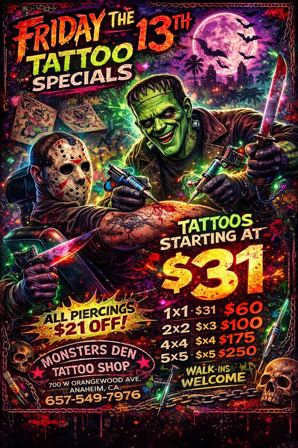 At Monster Den Tattoo Shop, we love our customers! Feel free to visit us during normal business hours, as walk-ins are always welcome. Our tattoo shop with piercing services is open Sunday through Thursday from 11 am to 12 Midnight, and on Friday and Saturday from 11 am to 1 am the following day.