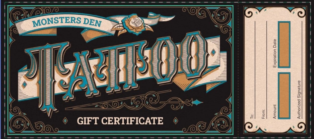 Looking for a unique gift idea? Give your friends and family a Monsters den tattoo shop gift certificate! Our gift certificates can be redeemed for any tattoo or piercing service and never expire.